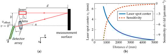 (a) Schematic of a laser triangulation setup consisting of a laser, a lens and a detector array in Scheimpflug condition. (b) Relation between the laser spot center and the distance d according to Equation (1). Sensitivity of the setup, defined by the shift of the laser spot center over the corresponding distance change. The detector is shifted in v-direction such that a maximum measurement distance of approximately 5000 is achieved ().