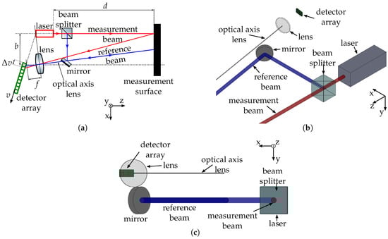 Several possibilities to compensate for errors have been listed in the introduction. As the previously proposed methods are either very complex or not capable of avoiding several errors simultaneously, a new compensation method is introduced here. The schematic setup can be seen in Figure 2, consisting of only an additional beam splitter and mirror. The laser beam is split up into a measurement and a reference beam, respectively. Those result in a measurement and a reference spot in the detector image, leading to the possibility to compensate for errors due to laser dithering, environmental conditions, and optomechanical shifts. Thereby, it is important that the reference beam is parallel to the optical axis of the lens. In this way, with a change of the distance d, the measurement spot center (MSC) is changing, whereas the reference spot center (RSC) is constant. In contrast, if is altered due to an error, changes in a similar fashion. Consequently, the deviation can be compensated by subtracting from . The setup can either be constructed by placing the lens and detector above or below the laser in y-direction, as shown in Figure 2c. Alternatively, the beam splitter could also be tilted around the z-axis instead. Additionally, a penta prism beam splitter can be used to ensure that the reference beam is split at an angle of 90°.