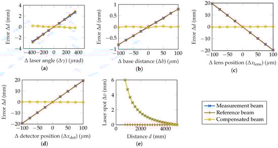 Simulated distance errors of the measurement beam, the reference beam as well as the compensated beam () in dependence of a deviation of (a) the laser beam angle, (b) base distance , (c) lens position , (d) detector position , and (e) measurement distance d.