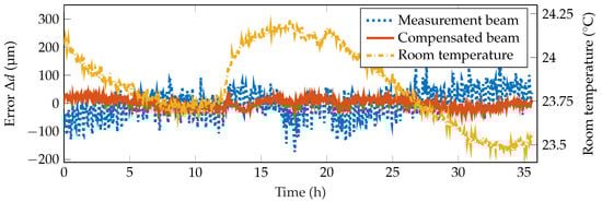 Measurement showing the compensation of drift effects. The measurement beam shows a stronger deviation than the compensated beam. A slight correlation of the measurement beam with the room temperature is visible.
