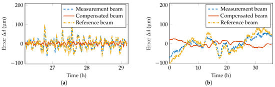 To emphasize the compensation of both short-term and long-term drifts, Figure 5a,b show an excerpt of the highpass- and lowpass-filtered signals, respectively. For frequencies below a period duration of 15 , it is clearly visible that the short-term variations of the signal have a high correlation of . Therefore, short term disturbances, e.g., due to laser beam dithering, can easily be compensated. Long-term drifts, which mainly happen due to temperature changes of the setup, have a similar correlation of , as can be seen in Figure 5b. Consequently, they can be compensated to a similar degree.