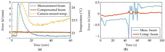 In additional experiments, vibrations of the measurement setup were provoked to test the ability of the setup to compensate for errors. The optical table on which the measurement setup is placed was mechanically moved. The resulting displacement of the measurement beam position and the compensated beam position is shown in Figure 6b. Whereas the measurement beam deviates by up to or peak-to-peak, the compensated beam deviation is reduced to or . Consequently, the deviation is reduced by 86%.
