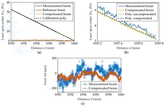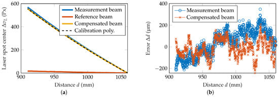In subsequent measurements, the improvement of the compensation setup in a distance measurement is shown. The measurement surface is moved in the range of 1050–1060 with a step size of 5 , driven by a linear translation stage with an on-axis accuracy of 5 (Thorlabs, NRT150). Thereby, the position of the measurement beam is dependent on the measurement distance d, while the position of the reference beam stays relatively constant, as can be seen in Figure 7a. Consequently, the compensated beam shows the same behavior as previously introduced in Figure 3e, opening up the possibility to measure the absolute distance. A calibration polynomial of third order is calculated for both the compensated and uncompensated beam, which can be used to transfer the measured and compensated laser spot center positions into distances.