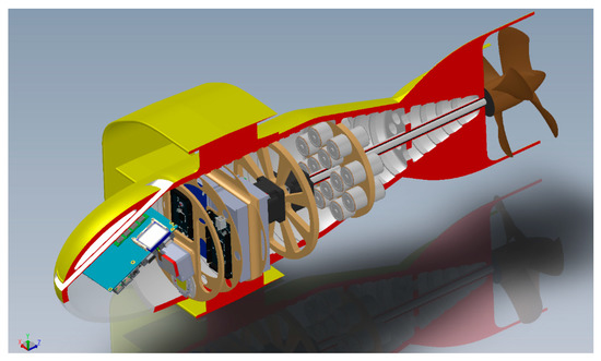 In the front bay, there is a radome with a “nostril” that houses the sensors kit: The data collected are managed by a computer. The nostril is inclined at 20° so that its flow is the least disturbed possible and its discharge flow does not create turbulence or disturbance to the flow of the elliptical wing. Below, there is the corresponding window of a digital camera (GoPro class) for visual inspection and automatic recognition of objects at depths, which, although modest, could be lacking in sufficient light; on the first bulkhead, a 106 candle, flat LED has been mounted [11,12,13,14,15,16]. Lighting for the camera is important in the case of operation in the low waters of the ports, notoriously turbid or, in co-current sources, coming from silty river mouths [17]. The general characteristics and performances (estimated) of our underwater vehicle are shown in Table 1.