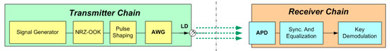 From a functional point of view, the Rx-Tx chain is described in Figure 2: It starts from the signal generator that, through the “NRZ-OOK” unit, passes to pulse shaping and then to the AWG (Arbitrary Wave Generator), which carries the signal to the laser diode: Downstream, we will find the focusing optical group (absent in the figure for clarity). The signal, revealed by the APD (avalanche photodiode), once synchronized and equalized, is sent to the key demodulation and, from there, to the navigation system of the drone.