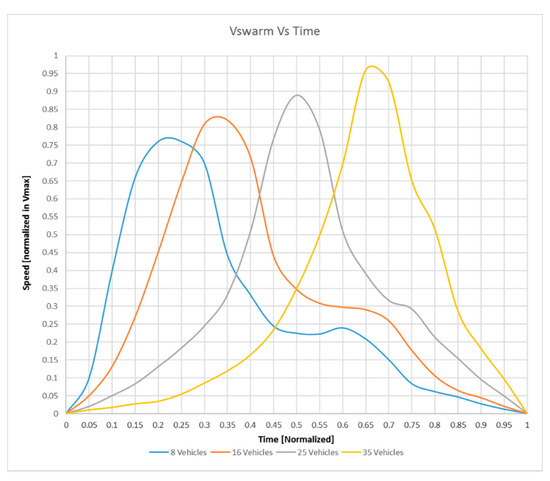 Velocity of the swarm vs. time: Parametric curves with 8, 16, 25, and 35 vehicles (time and speed are normalized).