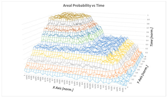 They are still concentrated in the corner but begin to push toward the center of the square. In Figure 8c,d, we still see two other phases of the expansion in which the drones begin to frequent even the most distant areas. In Figure 8e, we have a very low “swarm speed”; moreover, the probability density is almost constant. In Figure 8f, the evolution is completed: From a dynamic point of view, the drones move but their density is constant and the swarm speed is zero.