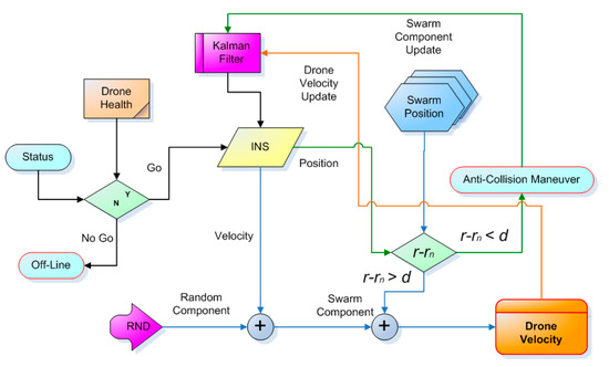 It starts (see Figure 7) from the previous status of the drone: its health (evaluated in accordance with the self-purging redundancy paradigm) is then inserted if this is off-line; otherwise, it is declared operational. In this case, it triggers the navigation cycle based on the inertial system (INS), which evaluates expression (30) of Section 2.6, which provides the speed to which a random part is first added and then the swarm component is added. First, however, it is also assessed on the basis of the proximity of the other drones: If one of them is too close, an automatic anti-collision procedure is started, which will then update the Kalman filter register. Eventually, we reach the speed of the drone: This data will also update the Kalman filter register. At the end, the speed data will return to the inertial computer (INS), which can be interrupted at any time by a possible malfunction that will make the health condition critical.