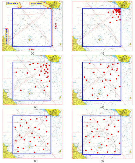 We observe the progressing development of the simulation. Figure 8a illustrates the blue square in which the simulation superimposed on the nautical chart of the Piombino strait takes place: All the drones (red dots) are inserted in the start point corresponding, for accuracy, to the commercial port of Salivoli. At time t = 0, they are all very close, almost coincident. In Figure 8b, we see the expansion of the drones at t = 0.5 h.