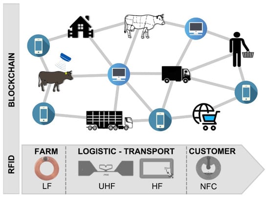 High quality meat producers could increase their income through a private certified information flux, which is costly to maintain nowadays, subject to a low degree of identification system standardisation and dependent on certification of trustworthiness by third parties. This situation causes the information flux on meat supply-chain traceability to be discontinuous and very costly, excluding a priori a great part of the possible stakeholders. To enhance the reliability of supply-chain traceability and its robustness against possible external inferences, the information about meat origin and processing could be guaranteed by blockchain technologies [3,4,5]. The disintermediation offered by blockchain technologies could solve part of the problems tied to the efforts of guaranteeing a trustworthy, efficient traceability system without the involvement of subjects who are external to the supply chain and who act as a trusted third party. Nevertheless, the physical identification of a single food item, packed or bulk, is often critical. Radio Frequency IDentification (RFID) technologies are also gaining attention in the field of intelligent meat packaging for accurate, real-time traceability and automatic sorting systems [6,7,8], which could be authenticated in joined RFID-blockchain systems [9,10]. Secure individual item tracking and secure data product association could be valuable methods in fighting counterfeits. In the meat supply chain, different types of tags for automatic identification, paired to blockchain authentication, can be used; an example of integration of RF technologies in a digitalised meat supply-chain traceability system is shown in Figure 1.