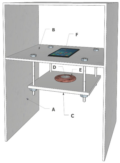 HF test bench: (A) low-density polystyrene structure, (B) central fixed shelf, (C) adjustable platform, (D) NFC tag, (E) meat sample and (F) Android smartphone embedding the NFC reader.