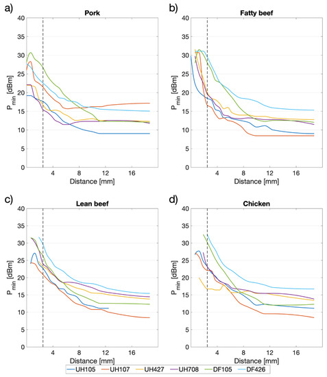 Mean values of the minimum power required to activate the UHF and DF tags (Pmin (dBm)) at increasing tag-to-meat distances (mm) when tested on different types of minced meat patties. The dashed lines highlight the minimum distance at which all the six tags were detected. Subfigure (a) regards pork, Subfigure (b) regards fatty beef, Subfigure (c) regards lean beef, while Subfigure (d) regards chicken.