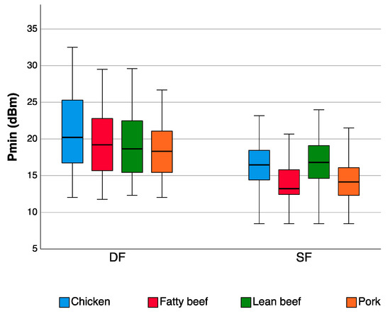 Comparison of the Single Frequency (SF) and Dual Frequency (DF) tag types on four meat types when detection is performed in the UHF band. The data are expressed as the minimum power required to activate the tags (Pmin (dBm)) on a box-plot graph. The tag types are compared in the 2.5–18.75 mm range of distances.