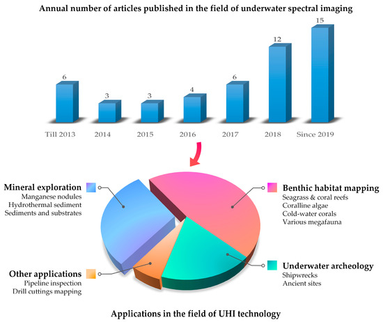| A comprehensive introduction to UHI, and observation and classification of objects placed manually on the seafloor by a UHI-carrying cart. | Underwater cart | Substrates, minerals, animals | Field | Johnsen et al. [24] (2013) |