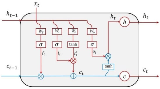 Hochreiter and Schmidhuber invented long short-term memory (LSTM) neural network on the basis of RNN [27]. Long time lags are unreachable to RNN architecture since the backpropagated error either decays exponentially or blows up [33]. LSTM introduced self-loops to generate paths where the gradient could flow, which thus solved the problem of the RNN gradient disappearing [27,34]. A hidden layer of LSTM contains a set of recurrently connected blocks, i.e., memory blocks. The input, output, and forget gates, as well as one or more recurrently connected memory cells consist in each memory block (Figure 5).