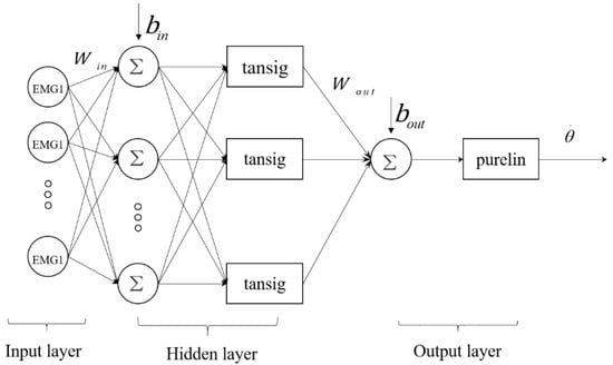 In this paper, we also selected a three-layer BP neural network (Figure 7) to construct the angle estimation model. The input and output vector were the same as the LSTM network. The tansig function and purelin function were used as the transfer functions from the input layer to the hidden layer, and from the hidden layer to the output layer [32]. The traingdm function was applied as the training function in the BP network. The learning goal, the learning rate, and the number of training epochs of the BP network were set to be 0.01, 0.1, and 50,000, respectively. The output angle of the BP network is shown in Equation (15).