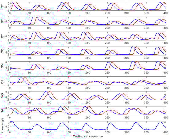 We verified whether RMS feature application and its time-advanced feature (RMSTAF) could effectively improve knee joint angle prediction accuracy. The method used RMS and RMSTAF feature signals of the eight muscles (sEMG) and the relevant knee angle as the input data and output data of the machine learning algorithms (LSTM neural network, BP neural network), respectively, to train the joint angle prediction model. The data curve of the input sequence and target sequence of LSTM is shown in Figure 8. The blue lines represent the RMS feature and knee angle; the red line represents the RMSTAF. Figure 8 shows the interrelationships among the RMS feature sequences, time-advanced feature, and joint angles. The angle data at this time corresponds to the sEMG at the previous moment. To prove the effectiveness of the time-advanced feature, the input data set was changed to the RMS feature of the sEMG signals of the above eight muscles. The BPNN algorithm was utilized to highlight the advantages of the LSTM algorithm in predicting the joint angle based on sEMG signals. In this paper, the above methods were named LSTM using RMS, LSTM using RRTAF, BPNN using RMS, and BPNN using RRTAF. By comparing the angle prediction results, we studied whether the application of the RMSTAF feature could improve knee joint angle prediction. The algorithm implementation and data processing software used in this study was MATLAB R2019a and the CPU of computer was Intel Core i5-10210U 2.11 GHz.