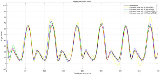 As an example, the knee angle estimation curves obtained via the above algorithms, which were based on data from subject 2 at a walking speed of 1.0 m/s, is shown in Figure 9. The black line represents the actual angle curve, whereas the yellow, blue, green, and red lines represent the estimated angle with BPNN using RMS, BPNN using RRTAF, LSTM using RMS, and LSTM using RRTAF, respectively. As can be seen from the figure above, the degree of similarity between the estimation curve and the actual curve is ranked as BPNN using RMS, BPNN using RRTAF, LSTM using RMS, and LSTM using RRTAF, from small to large. The estimation curve of BPNN using RRTAF, LSTM using RMS, and LSTM using RRTAF all have good smoothness. The smoothness of the curve obtained by BPNN using RMS is poorer than the above prediction curves. According to the comparison results, it can be concluded that LSTM using RRTAF had better performance in estimating the knee joint angle based on sEMG.