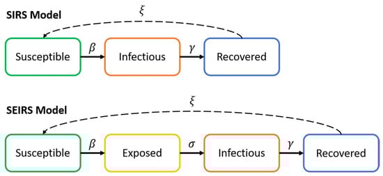 Generally, the spread of infectious diseases like COVID-19 are studied through the use of compartmental epidemiological models. Such models provide a simplified means of describing the transmission of the infectious disease through the different individuals within a population by dividing the individuals into different states regarding their current susceptibility to the disease and their disease transmission capabilities. Within such models, the SIRS (simplified version) [] and the SEIRS [] models are widely employed in the literature as simplified versions of the original model suggested by Kermack and McKendrick. A visual representation of the SIRS and SEIRS models is depicted in Figure 1. In addition to the SIRS and SEIRS models and based on the particular characteristics shown by COVID-19 in terms of the number of asymptomatic cases and the differing severity of the disease regarding various personal conditions, a number of extensions to SIRS and SEIRS have been established and studied which divide the population into sub-compartments based on age and other factors [,,,,].