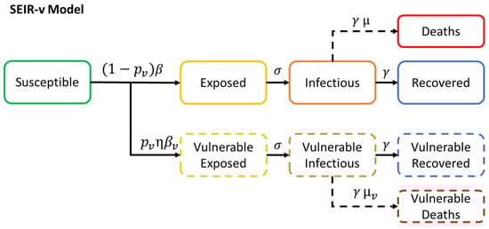 where S is the number of susceptible individuals. E, I, R are the number of non-vulnerable exposed, infectious and recovered individuals respectively. Ev, Iv, Rv are the number of vulnerable exposed, infectious and recovered individuals respectively. D is the total number of deaths caused by the disease. pv is the probability of an individual being vulnerable to the disease. β and βv are the contact rates by non-vulnerable and by vulnerable individuals respectively. σ is the rate at which an exposed individual becomes infectious. γ is the rate at which an infectious individual recovers from the disease. µ and µv are the case fatality rates for non-vulnerable and for vulnerable individuals respectively. However, it is clarified that two susceptible groups could be also used, having 80% of the population in S and the remaining 20% in , in the model proposed, and then a similar outcome can be obtained with the use of the control parameter  (probability of an individual being vulnerable to the disease). A conceptual diagram of SEIR-v can be seen in Figure 3.
