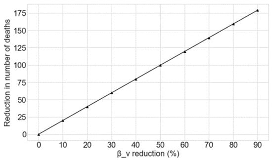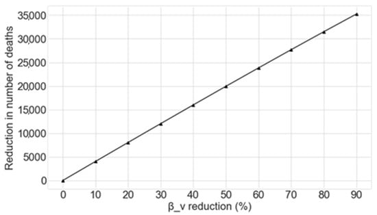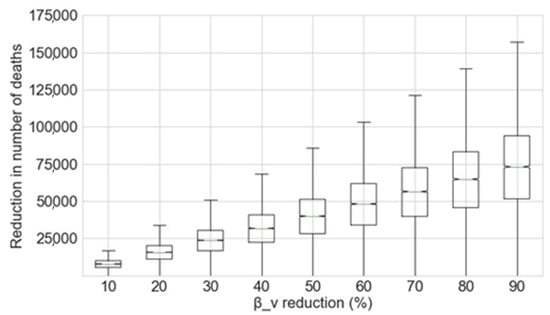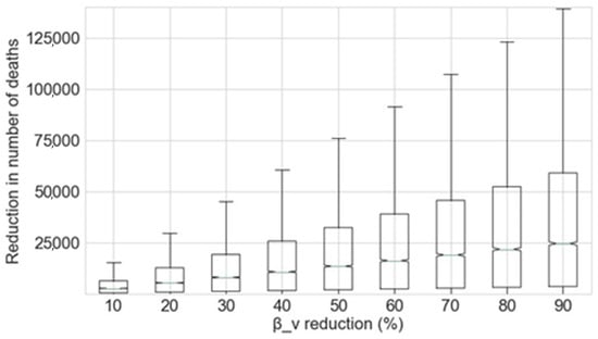 The potential reduction in the number of deaths caused by COVID-19 as a function of the percentage decrease applied to βv achieved by the Monte Carlo simulation is shown in Figure 4.