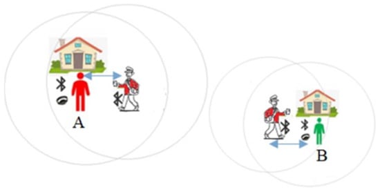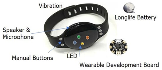 Contact tracing, which has been used alongside other protection measures across the world, can keep a record of any new infection cases and anyone who has been close to them []. This could enable uninfected and immune people to leave their homes, and people who might have been infected, could be instructed to self-isolate. However, contract tracing is time consuming and resource intensive and to be strictly accurate and valid would require 100% adoption. Bluetooth technology has been used previously for messaging and the tracking of nearby devices using proximity detection [,]. Apple and Google along with many health authorities have proposed smartphone hosted apps that use Bluetooth Low Energy (BLE) to automate the contact tracing process []. BLE is a form of wireless communication designed especially for short-range communication that is suitable for situations where battery life is preferred over high data transfer speeds. Unfortunately, vulnerable and older people are more likely to use older smartphones that are not equipped with the BLE feature, e.g., about 9–12% of smartphones in the UK lack the BLE functionality needed for it to work. In addition, data from Ofcom shows that while around 80 per cent of all adults owned a smart mobile phone in 2018, only 47% of 65–74 year old’s, and 26% of over 75s did []. This is supported by data published by Statista, which indicates that only 40% of over 65s used a smart phone to connect to the internet in 2019 []. Furthermore, many people have privacy concerns about using their smart phone as a tracer and might not be willing to download a contact tracing app. With this in mind, three possible solutions to support vulnerable people are proposed (1) contact Tracing wristband or wearable, (2) a social distancing alert mechanism and, (3) a wearable to monitor symptoms.