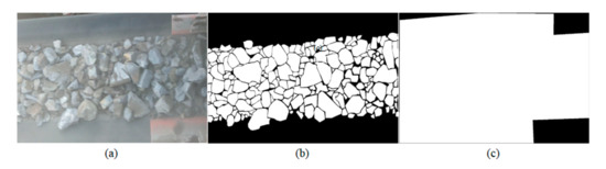 In order to create a deep learning sample set and meet the needs of comparative analysis of experimental results, we take the belt section as the background and use the image labeling tool LabelMe to manually describe the boundaries of the ore fragments. At the same time, the mask is used to shield the area outside the image upload belt and keep the area within the field of view. Finally, the label maps and mask maps were obtained after binarization, as shown in Figure 2.
