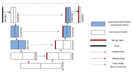 Figure 6 shows the detailed design of a normal convolution block and an improved deformable convolution block. Each improved deformable convolution block uses the convolution offset layer and the convolution layer to extract feature information, and uses residual connections to add the original feature map and the feature map after this structure, and simultaneously transfers shallow level information and deep level information to the next convolutional layer to extract features. Since the number of channels of the feature map after convolution becomes 2 or 1/2 of the original, this paper cannot use the method of ResNet to improve the network by adding several residual structures to a convolutional layer directly, but adds a 1 × 1 size convolutional layer to the residual connection, so that the dimension is unified when the residual is added to the current feature map. In order to solve the internal covariate shift problem and speed up the training processing speed, a batch normalization layer is inserted after each unit. The detailed structure of RDU-Net is shown in Table 1.