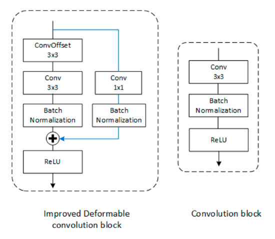 Detailed design of ordinary convolution block and improved deformable convolution block.