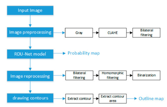 The algorithm flow chart of this paper is shown in Figure 7. Firstly, the input image is preprocessed (gray, CLAHE, bilateral filtering) to make it easier to segment, and then it is transferred to the trained model to learn the recognition features and generate accurate segmentation results. Furthermore, in order to more fully evaluate the segmentation effect of the RDU-Net model, we need to accurately draw the outline of the ore fragments, so the probability maps output by the model need to be processed again (bilateral filtering, homomorphic filtering, binarization) to make the edges of the ore in the probability maps clearer. Finally, use OpenCV to find the outline of the ore fragments and draw it on the input image.