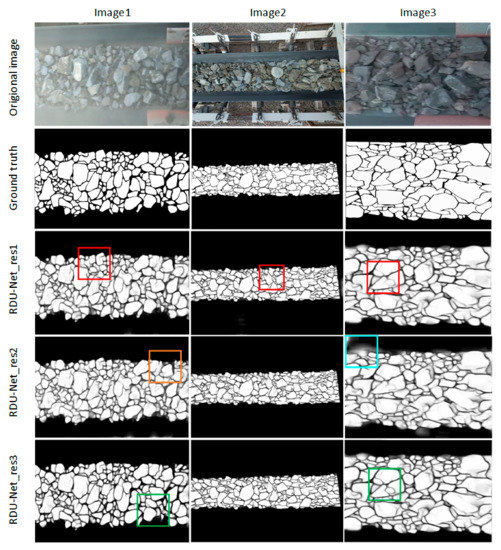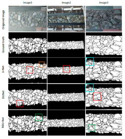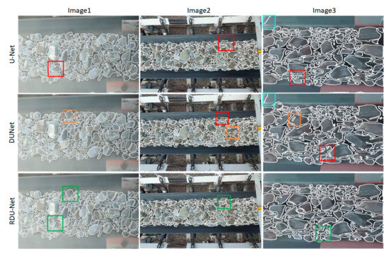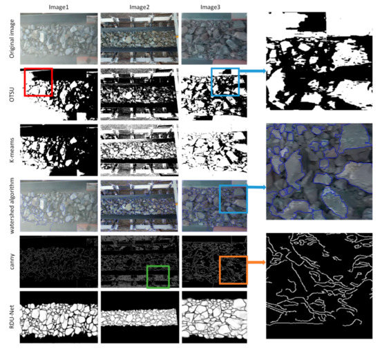 In order to explore the feasibility of the proposed RDU-Net ore image segmentation model, this paper makes a simple comparison with traditional segmentation methods such as canny contour extraction algorithm, OTSU, watershed algorithm, and K-means. As can be seen from Figure 9, Otsu, watershed algorithm and K-means algorithm can easily judge the dark part of the ore as the background, and the ore fragments are seriously adhered, and there are a lot of noise and under segmentation problems (Figure 9 blue box). Moreover, for images with uneven brightness such as image1, they cannot be well processed (Figure 9 red box). Canny edge detection algorithm will appear many discontinuous edges and will extract the wrong texture of the ore surface, but also cannot deal with the adhesive part (Figure 9 orange box). These algorithms cannot eliminate the influence of the conveyor belt and objects outside the conveyor belt (Figure 9 green box). The experimental results show that these traditional segmentation algorithms are not suitable for ore image segmentation on conveyor belt. The RDU-net algorithm proposed in this paper has a good segmentation effect for the ore image on the conveyor belt, which can effectively process the conglutinated ore fragments and effectively segment the ore fragments in the dark area, and perfectly shield the influence of the objects outside the conveyor belt and the conveyor belt.