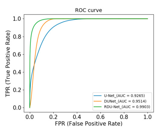 In addition, we use the ROC curve to evaluate the model. In ROC coordinates, the closer the ROC curve is to the upper left boundary, the more accurate the model is. As shown in Figure 11, the RDU-Net curve is the upper left corner of the three models, and the U-Net curve is the lowest one of the three models. In addition, the Figure 10 also shows that RDU-Net has the largest area under the ROC curve (AUC). Based on the above, RDU-Net has significant performance in solving the problem of ore image segmentation.