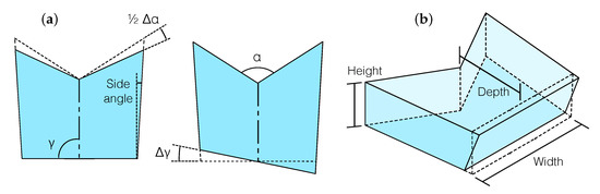 To analyze the sensitivity of the detector to manufacturing tolerances of the prism, we inject different types of geometrical errors into the OH model. Among the geometrical parameters that are critical to the performance of the device, we distinguish between two types: relative alignment errors between the optical surfaces, parameterized by angles and (Figure 4a); and deviations from perpendicularity of the optical surfaces relative to the base of the prism (Figure 4b). The former couples to beam misalignments on the -plane, and may be compensated to some degree by realigning the fiber injectors; the latter causes beams to veer off-plane and its compensation is unfeasible.