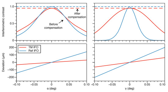 Sensitivity to manufacturing imperfections affecting the relative alignment between optical surfaces, as parameterized by the (left) and (right) angles. The top plots show the interferometric contrast as a function of the deviation from the nominal geometry for both interferometers with and without compensation by altering the alignment of the input beam direction. The input beam direction is tuned by translating the fiber injector by up to 1 mm, and rotating it by up to 0.5 degree. The bottom plots show the deviation from the nominal optical pathlength difference between the arms in both interferometers due to the required compensation.
