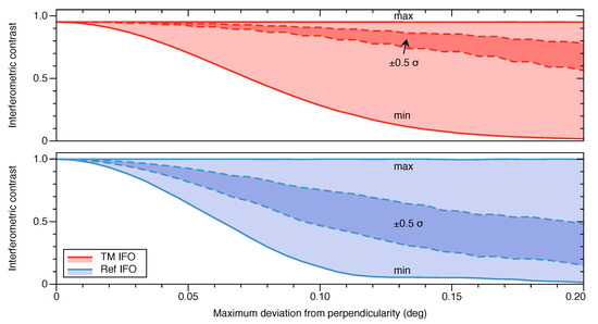 Sensitivity to manufacturing imperfections affecting the perpendicularity of the optical surfaces. The plots show the degradation of the interferometric contrast as a function of the amplitude of the uniform distribution of deviations from perpendicularity injected into all three optical surfaces of both interferometers. The number of Monte Carlo samples at each point is 1000. The dark-shaded area bordered by dashed lines corresponds to , while the light-shaded region is bordered by continuous lines representing the maximum and minimum of the distribution.