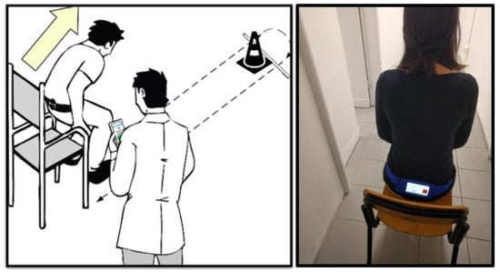 Illustration of the test set-up for the Timed Up and Go (iTUG).