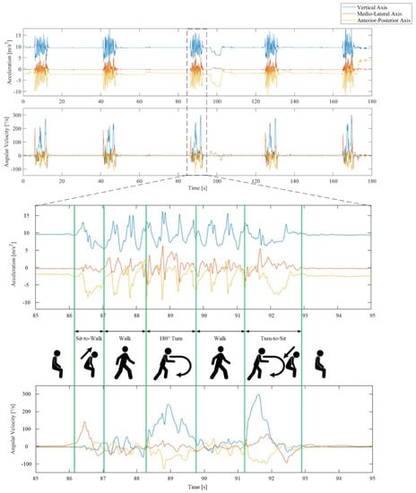 The 3-axis acceleration (upper) and angular velocity (lower) sensor signals recorded during five repetitions of an iTUG for one subject. The task is segmented into five phases separated by the green vertical lines.