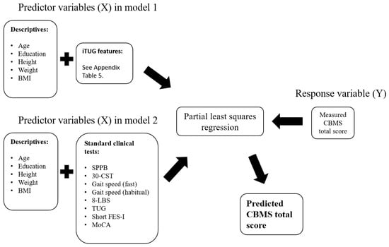 Demographics and other characteristics of the study population include age, sex, height, weight, body mass index (BMI), and number of years of education. Continuous variables are summarised as mean (SD). In the case of dichotomous variables, the number of participants in each category is provided. Descriptive variables were included in the partial least squares regression (PLSR) analysis in both models (Figure 3). Two PLSR analyses were run, one with iTUG features as predictor variables (predictor model 1) and one with standard clinical tests as predictor variables (predictor model 2). The response variable was the CBMS scores in both analyses.
