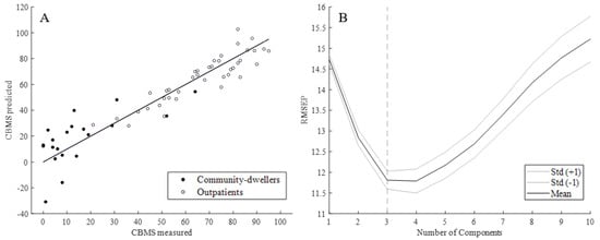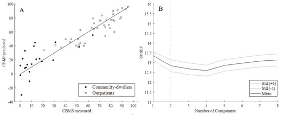 (A) Predicted vs. measured CBMS total score from standard clinical tests for outpatients and community-dwellers; (B) mean RMSEP +/− one standard deviation across eight components.