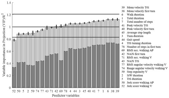 The VIP scores (light grey) and R2 (dark grey) of the iTUG features selected in the PLSR model. The horizontal lines represent the lower (0.83), middle (1) and upper (1.21) cut-off values used for interpreting the VIP of individual predictor variables.