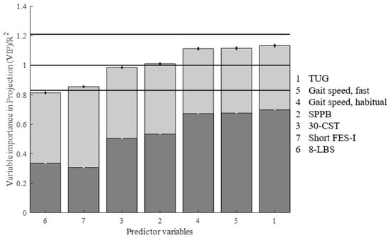 Mean RMSEP with two components was 12.85 (Figure 6). The RMSEP was not significantly lower with more than two components, and RMSEP of CBMS prediction with the iTUG model was significantly lower than with standard clinical tests (Figure 4B and Figure 6B, p ≤ 0.0001). Four variables in the model had VIP values between the cut-offs 1 and 1.2, two were between 0.8 and 1, and one variable had a VIP below 0.8 (Figure 7).