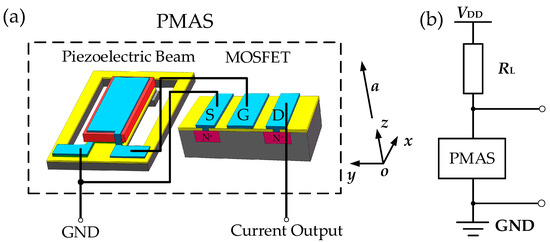 The structure of PMAS is shown in Figure 1a. It consists of a piezoelectric beam and an N-channel depletion MOSFET. The piezoelectric beam is a two-ended device: one end is connected with the source of MOSFET as the ground terminal of PMAS, the other end is connected with the gate of MOSFET to control the output current of MOSFET, and the drain of MOSFET is the current output terminal of PMAS. The direction of the measured acceleration is parallel to the z-axis as shown in Figure 1a. The acceleration applied by the vibration system is reciprocating up and down along the z-axis. Therefore, the output signal of the piezoelectric beam is a sinusoidal signal with a certain frequency. The N-channel depletion MOSFET is chosen to ensure that the MOSFET works in the triode region. As shown in Figure 1b, a load resistance RL is used in series with PMAS to convert the current signal into a voltage signal for output.