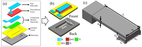 Basic structure of piezoelectric beam: (a) explosion view; (b) front and back side, (c) dimension of the cantilever beam.