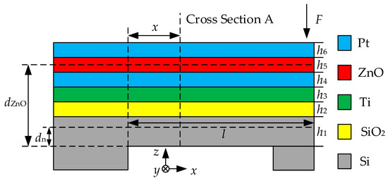 The stress analysis of the piezoelectric beam is shown in Figure 4. dZnO is the distance from the ZnO thin film to the bottom of the Si substrate, dn is the distance from the neutral plane of the multilayer structure to the bottom of the Si substrate, h1, h2, …, h6 represent the thickness of Si, SiO2, Ti, Pt, ZnO and Pt layers, respectively.