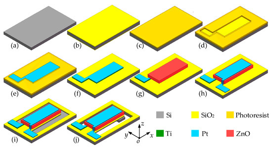 Figure 5 shows the fabrication process of the piezoelectric beam. The n-type <100> orientation silicon wafer was cleaned by the standard Radio Cooperation of America (RCA) process (Figure 5a), and the silicon dioxide layer was grown by the thermal oxidation method as the isolation layer (Figure 5b). In the manufacturing process of Pt/ZnO/Pt/Ti piezoelectric multilayer structure, the lift-off process is selected to complete the fabrication of the piezoelectric multilayer structure. As shown in Figure 5c–h, firstly, the photoresist is evenly coated on the surface of the substrate layer, then patterned by photolithography. The Pt/Ti composite electrode is coated by RF magnetron sputtering, and the photoresist is removed by the stripping solution to complete the fabrication of the bottom electrode. ZnO layer and top electrode were also prepared by the lift-off process as the Pt/Ti bottom electrode. After that, the cantilever structure is released by twice photolithography and inductively coupled plasma (ICP) etching to complete the fabrication of the piezoelectric beam (Figure 5i–j). In order to improve the piezoelectric properties of the ZnO piezoelectric layer, we doped ZnO with lithium. Li atoms with a small atomic radius as acceptor impurities can increase the resistivity of the ZnO piezoelectric thin film and increase the output impedance, thereby achieving the purpose of improving the piezoelectric properties of ZnO. During the preparation process, most of the doped lithium atoms will replace the positions of the zinc atoms and cause the decrease of the lattice constant. As a result, the residual stress in ZnO thin film is compressive stress [37].