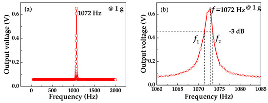 The frequency characteristic of the piezoelectric beam was analyzed by the sweep mode of the vibrator. The range of the excitation frequency was set from 20 to 2000 Hz, and applied acceleration was 1 g constant along the z-axis direction of the piezoelectric beam. The piezoelectric beam was rigidly connected with the vibration table by a customized fixture. When the excitation frequency reached a certain value, the output of the piezoelectric beam reached its maximum value for the first time. At this time, the excitation frequency was the first resonance frequency of the piezoelectric beam. Figure 7a shows the relationship between the output voltage and the excitation frequency of the piezoelectric beam. When the excitation frequency reached 1072 Hz, the output of the piezoelectric beam reached the maximum value of 0.649 V. There is only one peak within 50–2000 Hz, which proves that 1072 Hz is the first-order resonance frequency of the piezoelectric beam.