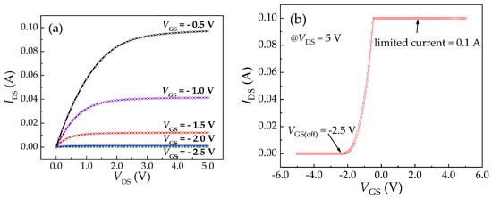 The I-V characteristic and transfer characteristic curves of the MOSFET were tested by 4200SCS, as shown in Figure 8a. Considering that the maximum limited current of 4200SCS is 0.1 A, the voltage range of VGS was set from −2.5 V to −0.5 V with an increment of −0.5 V. Figure 8b shows the transition characteristic curve of MOSFET, VDS is 5 V in testing. It can be concluded that the pinch-off voltage of MOSFET (VGS(off)) is −2.5 V; with the increase of VGS, the IDS also increases. When VGS reaches −0.45 V, the limit current of the test instrument 0.1 A is reached.