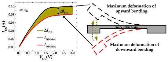 The test circuit shown in Figure 1b, 4200SCS, is connected with two output terminals of PMAS for data acquisition. The output voltage of the piezoelectric beam was used as gate voltage of MOSFET. In order to ensure that the output voltage of the piezoelectric beam can reach the maximum value, the test frequency was set at 1072 Hz, which is the resonance frequency of the piezoelectric beam. The I-V characteristic curves of the MOSFET are shown in Figure 9 (VDD = 5 V, RL = 10 kΩ and applied acceleration was 1.5 g). Under the external acceleration generated by the stander vibration system, the proof mass drove the piezoelectric beam to vibrate up and down, which makes the IDS of MOSFET fluctuate in a certain range. The maximum and minimum values of the wave range correspond to the maximum deformation of upward and downward bending of the piezoelectric beam, respectively. When VDS is a certain value, the difference between the upper and the lower limit is ΔIDS. With the increase of external excitation acceleration, the vibration amplitude of the piezoelectric beam increases and further increases the width of the curves. That means ΔIDS will increase with as acceleration increases. Because the signal produced by the piezoelectric beam is sinusoidal under the action of the stander vibration system, ΔIDS can be used as an important parameter to measure the output sensitivity of PMAS. In the test circuit of Figure 1b, by selecting appropriate load resistance RL, PMAS can amplify the signal of the piezoelectric beam so as to improve the sensitivity of output voltage.