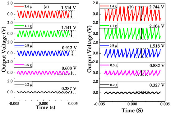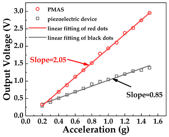 Figure 10a shows the output voltage curves of the piezoelectric beam and PMAS, where the peak-to-peak value of the output sinusoidal curves are defined as output voltage Vpiezo and VPMAS. Vpiezo increased from 0.287 V to 1.314 V at the excitation frequency of 1072 Hz, and the acceleration range was from 0.2 to 1.4 g. It can be concluded that Vpiezo increases with the increment of excitation acceleration, and the relationship between them is approximately linear. Figure 10b shows the output voltage curve of the PMAS (VPMAS). In the conditions of excitation frequency of 1072 Hz and applied acceleration range from 0.2 to 1.4 g, VPMAS increased from 0.327 V to 2.744 V. Compared with Vpiezo, at the same condition VPMAS increased significantly and VPMAS was approximately linear with the excitation acceleration.