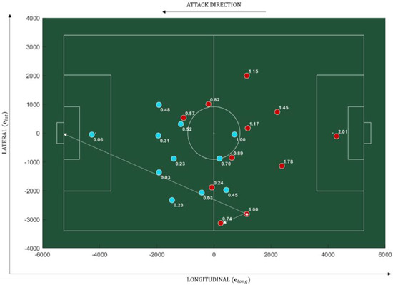 In Equation (1), the PBGA, , was calculated using the planar coordinates for each player, , ball, , and goal, , at every time frame, , expressed as vectors, namely: